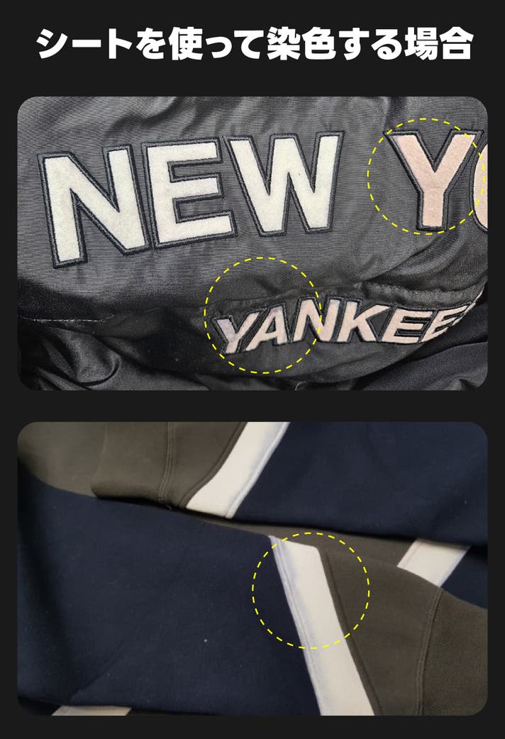 また、洗濯機で染色する方法の場合、衣類のタグやロゴの刺繍、または黒以外の部分にまで染料が移ってしまい、意図しない箇所まで色移りしてしまうことがよくあります。