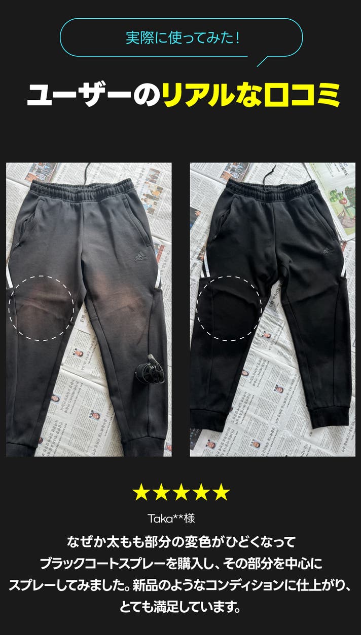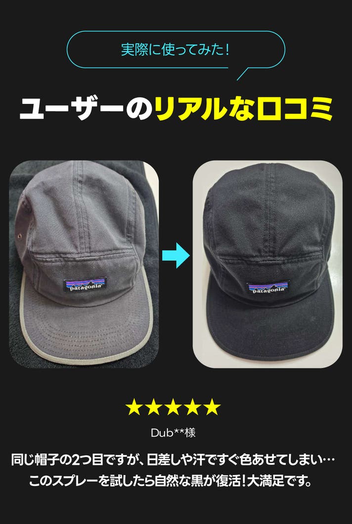 パンツの一部が色あせた部分にもスプレーするだけで簡単にカバーでき、帽子やバッグなどにも使えるので、とても満足しています。
