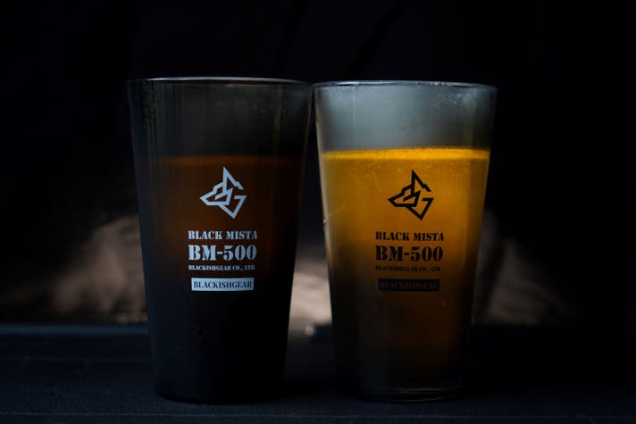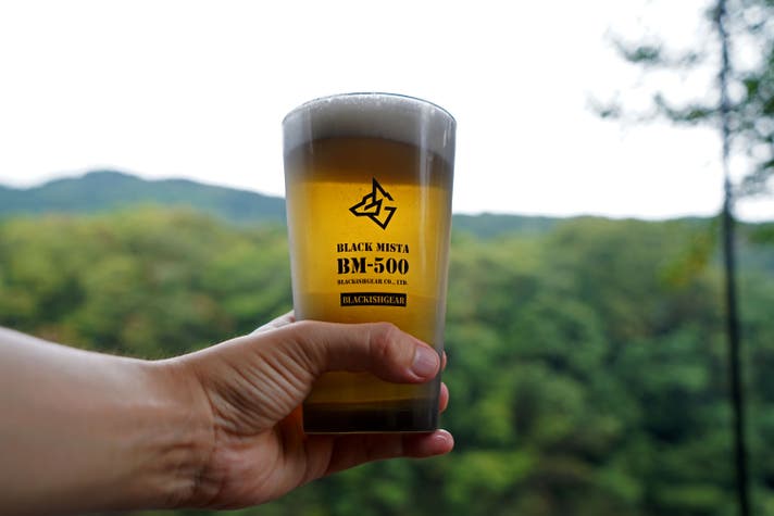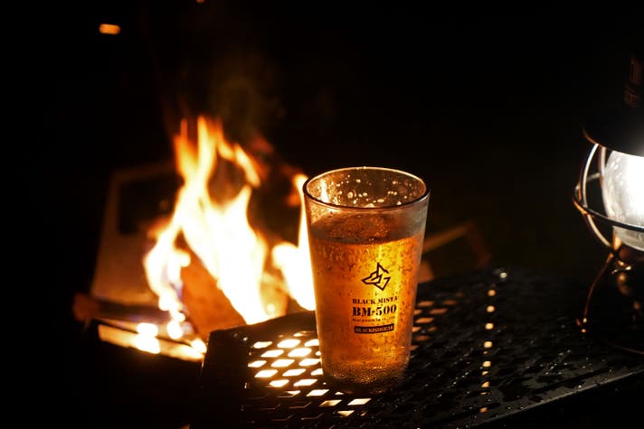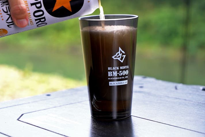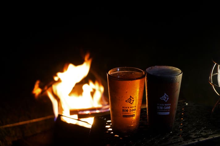キャンプで飲む一杯を特別に変える、黒いパイントグラスがここにあります。
