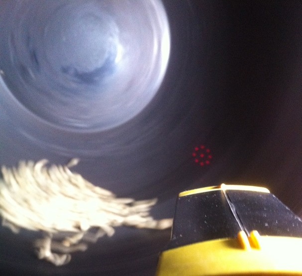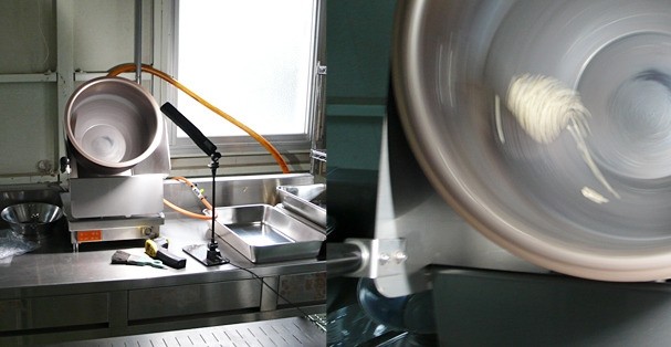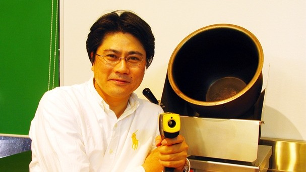 まず、珈琲豆焙煎の研究が始まります。珈琲専用の焙煎機械は使用せず、ほうじ茶用の焙煎機械で生豆の焙煎にチャレンジです。珈琲豆の焙煎は温度の調整が難しく、はじめは弱火、徐々に中火から最後は強火で煎り上げます。写真は釜温度をレーザー温度計で測定しているところです。
