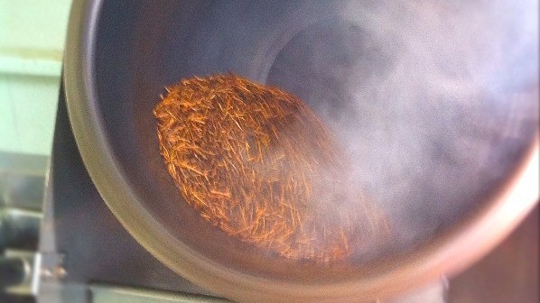 280度の温度で煎り上げている写真です。香ばしいほうじ茶が出来上がります。