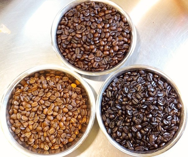 焙煎度合いは3種類、左がシティロースト(中煎り)、上がフルシティロースト(深煎り)、右がフレンチロースト(極深煎り)、深いほど豆の色が濃くなります。
