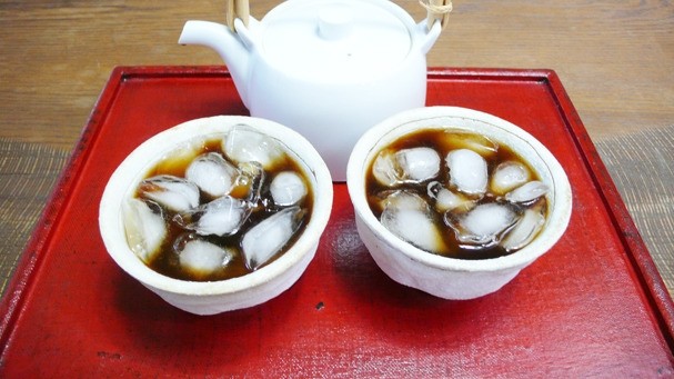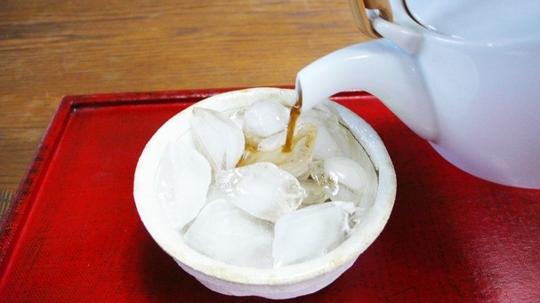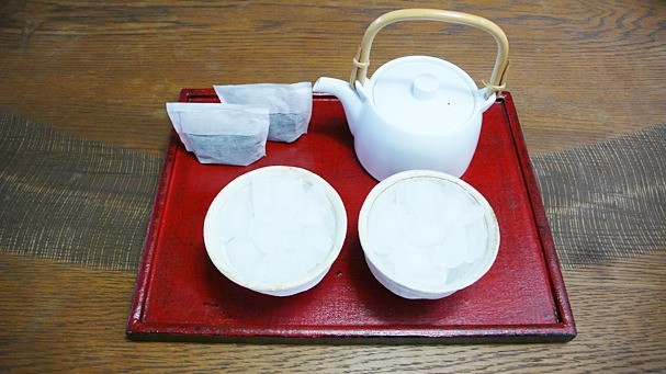 大きめの急須と湯呑みを2客準備して、湯呑みに氷を多めに入れておきます。