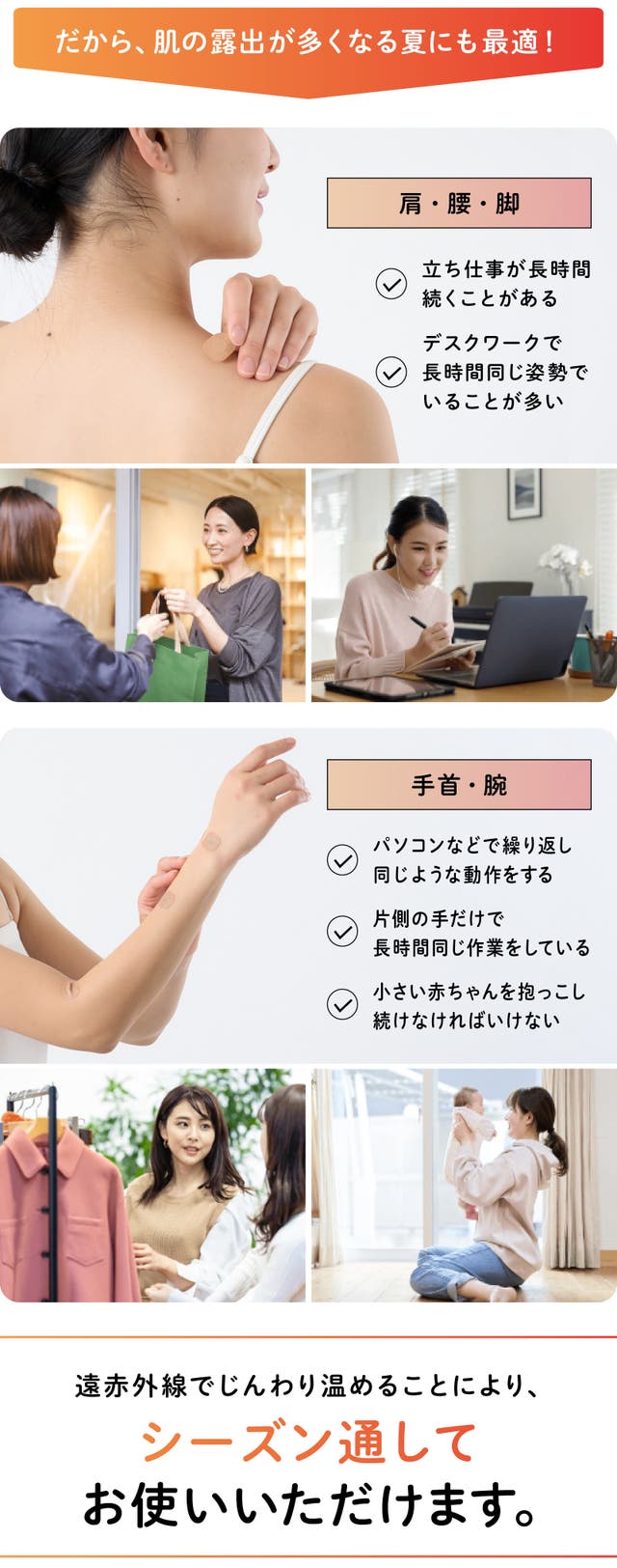 手や腕など露出の多いところに貼っても目立たず、薄着になる夏場でも、気兼ねする必要はありません。