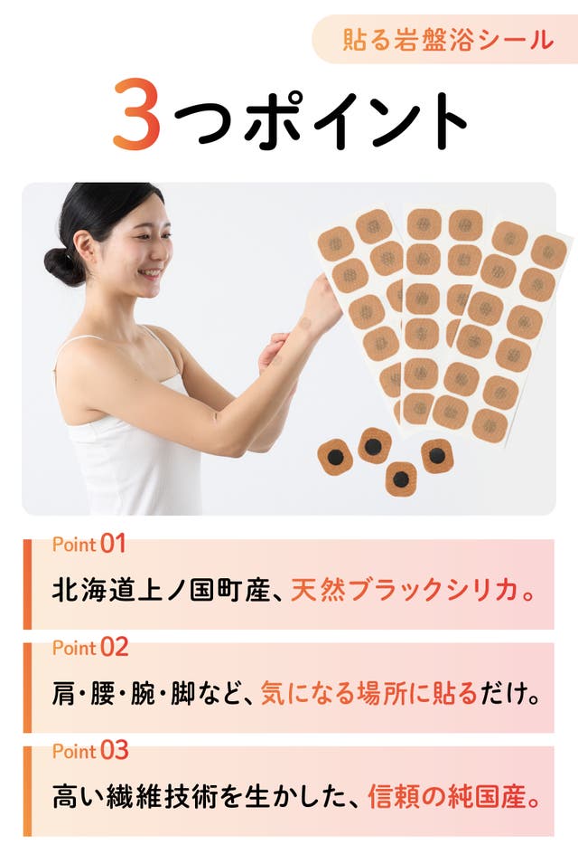 今回ご紹介する「ブラックシリカ岩盤浴シール」は、北海道上ノ国産ブラックシリカの遠赤外線で、肩・腰・腕・脚・手先・足先といったピンポイントの場所に貼るだけで、その部位をじんわり温めくれる商品です。目立ちにくいので、薄着になる夏場でも気兼ねなくご利用いただけます。