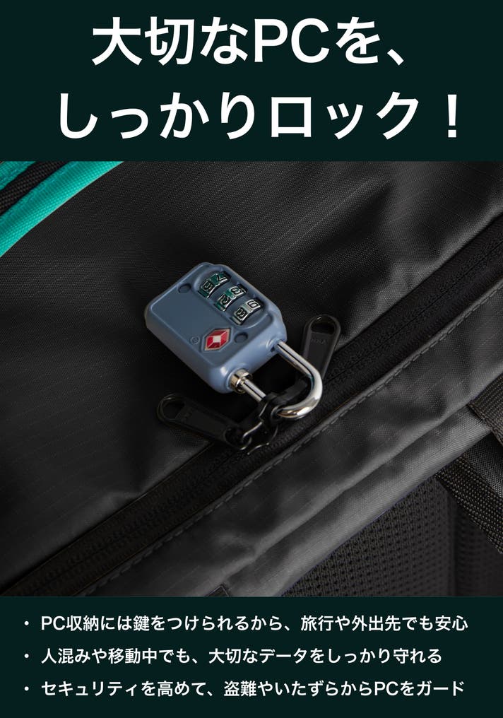旅先や出張先で心配な、カード情報の盗難やスキミング被害を防ぐRFIDポケットを搭載。さらにパスポートやスマホを守る隠しポケット、PCや重要書類を守るロック対応ファスナーも備え、どこへ行くにも安心です。