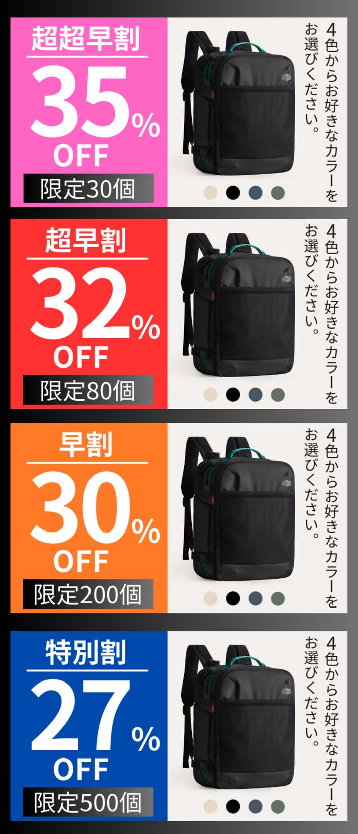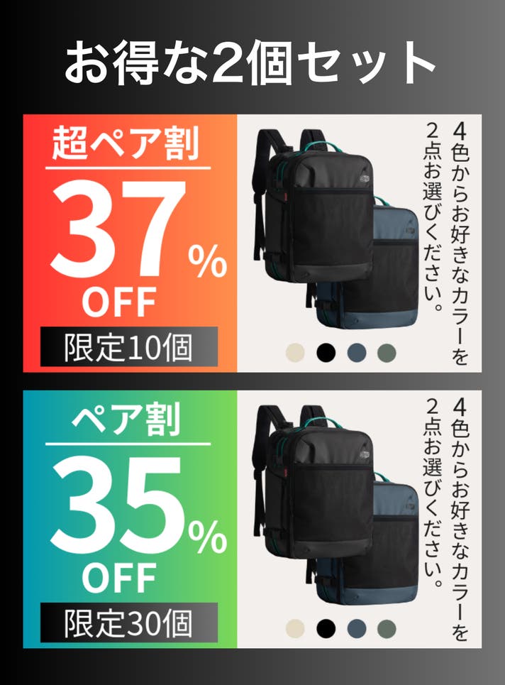 40Lの大容量で機内持ち込みに対応しながら、登山級のプロ仕様で背負いやすく、スーツケースのようにフルオープンできるメイン収納、靴や汚れ物を分けられる換気付きコンパートメント、防水PVCポケット、RFIDブロックポケット、防犯用の隠し背面ポケットなど、多用途に耐えうる機能を搭載しました。