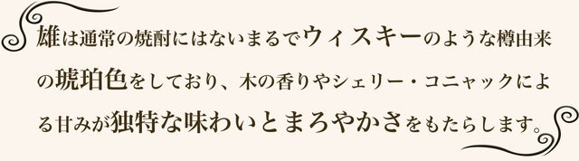「雄」は、明治32年に創業した老舗酒造による、ホワイトオーク樽・コニャック樽・シェリー樽で1988年から熟成された原酒を、継ぎ足しながらブレンドする度に抽出し、米麹の甘さや麦の香ばしさを残しながらも樽由来の香りがバランスよく配合された、こだわりの熟成麦焼酎です。