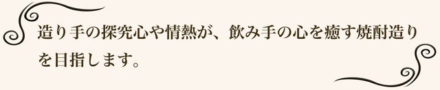 読書家でも知られている五代目は、常に国内外の焼酎の製造に関するあらゆる文献を研究しています。 古式かぶと釜蒸留の再現も、その研究と試行錯誤の成果の一例です。 自らの手で古き伝統を絶やさず未来へと繋げ、そこに新しいアイデアを加え満足のいく焼酎が仕上るまで何度も挑戦し続けます。