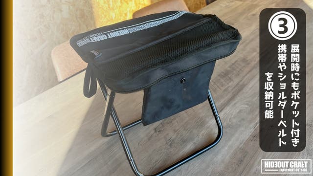持ち運びが便利なコンパクトチェアにポケットをつける事によりカバンの要素をプラスしました