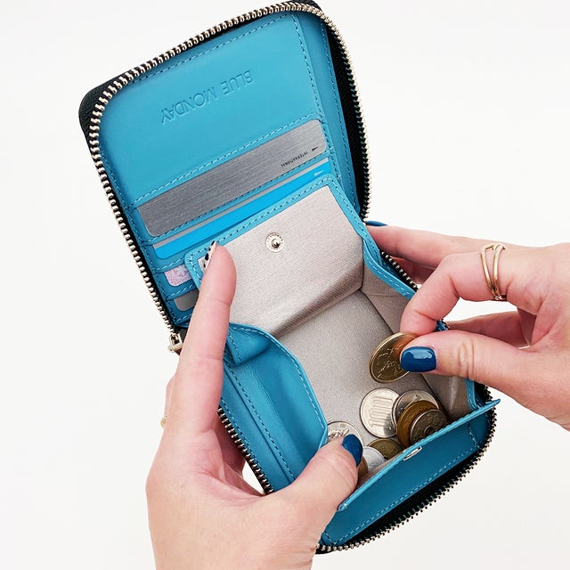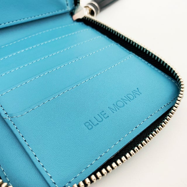 中を開くと目の前に広がるブルーカラー。このブルーはブランドカラーをイメージした色で、どの色見本帳にも無い、日本のタンナー(革の鞣し職人)さんにお願いして作って頂いた「BLUE MONDAY」オリジナルの色なのです。