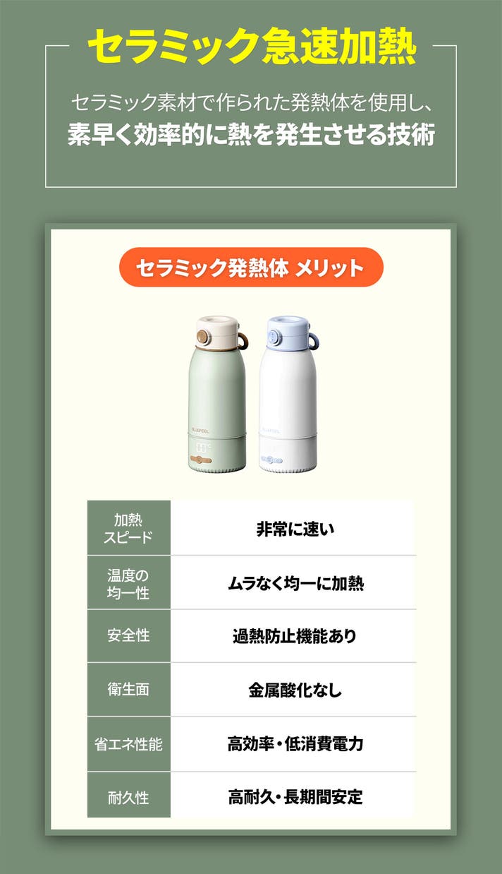 ・高効率なスマートヒーター構造、温度を正確に制御するNTC温度センサー、過熱・過電流・過電圧を防ぐ多重保護回路を組み合わせ、コードレスでありながら実用的な加熱性能を実現しました。