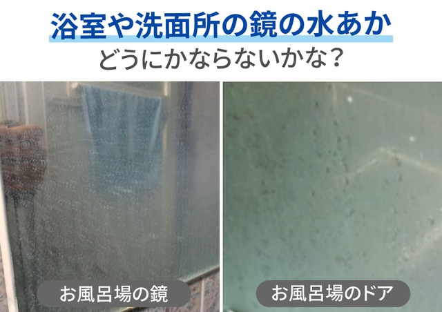 お風呂場の鏡によくみられる水滴や石けんカスがついた水あか。