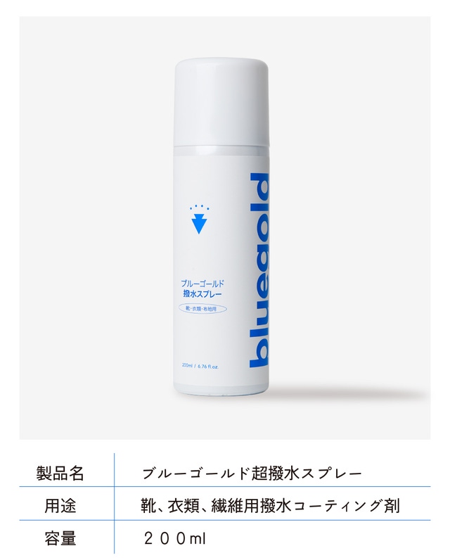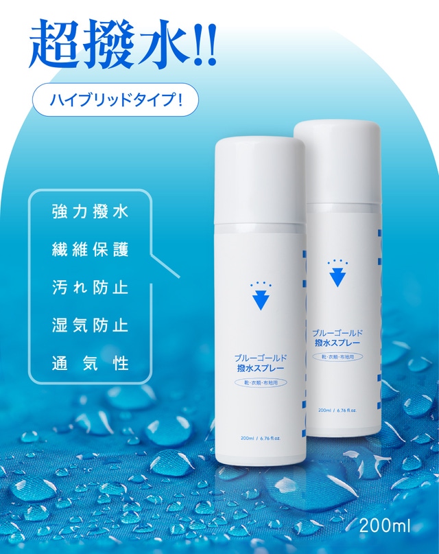ブルーゴールド超撥水スプレーは繊維に撥水液を浸透させて繊維に保護膜を形成します。