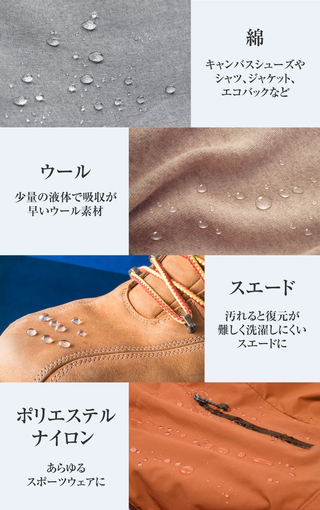 しっかり水をはじきながらも通気性も優れており、夏場のスニーカーやジャケットにかけても快適に過ごせることができます。