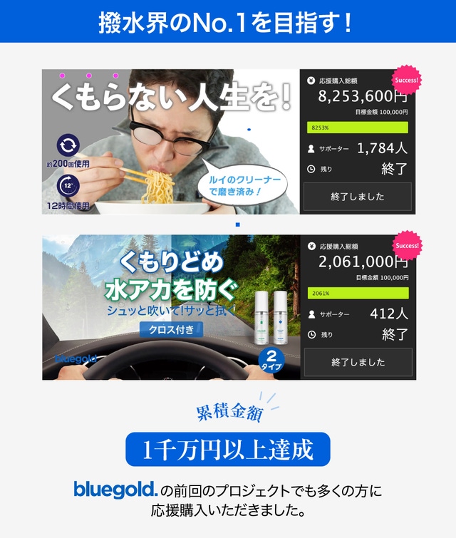 ブルーゴールドはくもり止めに使用する超親水と超撥水技術を基盤に様々な生活用品を製造する企業です。