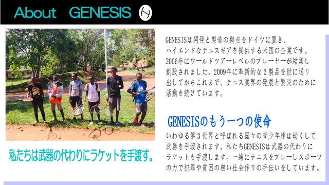 - GENESISはテニス製品の提供だけでなく、貧困に苦しむ人々の生活を変える活動を行っています