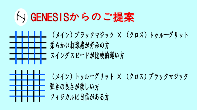 柔らかい打球感が欲しい、スイングスピードが比較的遅い方はメインをブラックマジック、クロスをトゥルーグリットにすることをお勧めいたします。