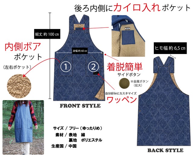 かわいく魅せて気になる体型までカバー、お尻まで隠れるので動きのある作業も気にならない。 両サイドに付いた金属スナップボタンで着脱が簡単。少し太めの肩紐はしっかりカラダになじんで安定。 前側にも後ろ側にも付いたポケットは使い勝手抜群。ポケット 裏地までボア生地だから、寒い日は思わず手を入れたくなるあたたかさ。 その日の気分に合わせてワッペンを付け替えて、自分好みにカスタマイズも楽しめます。