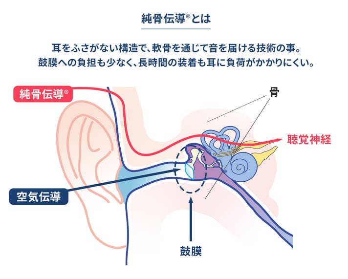 耳をふさがない構造で、軟骨を通じて音を届ける「純骨伝導®技術」を採用。