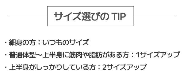 ※肩や上半身がしっかりしている方は、ツーサイズ上をお選びください。