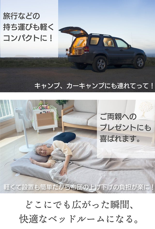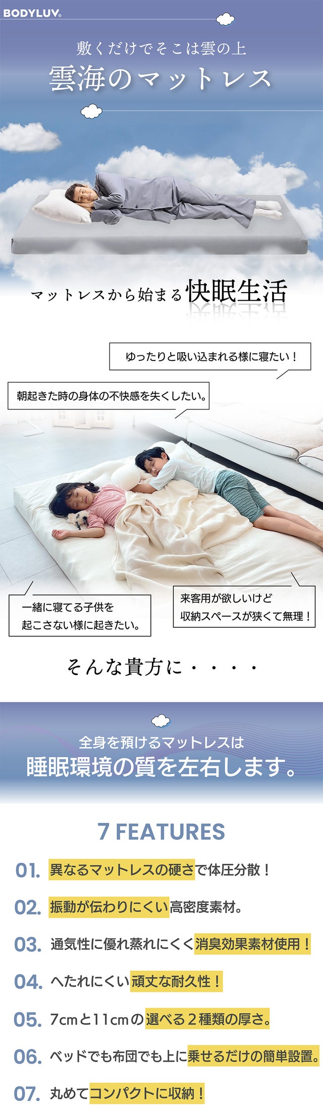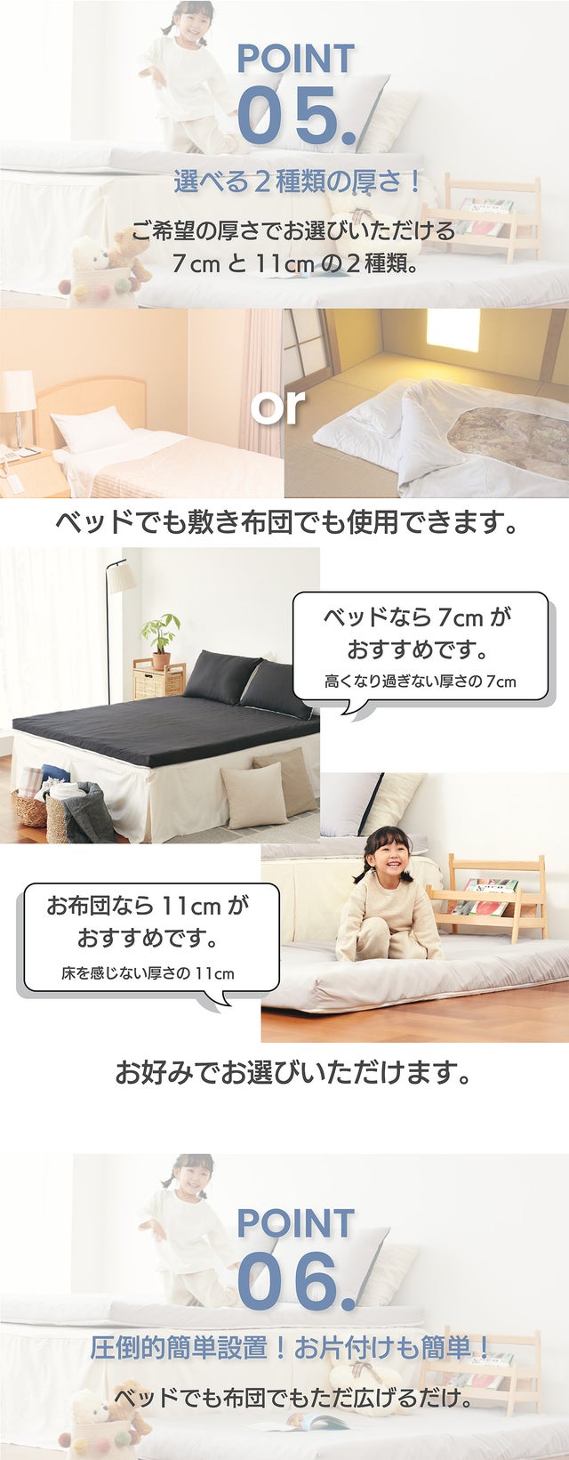 - 今の寝具に乗せるだけ!7cmと11cmの厚さが選べ布団派でもベッド派でもOK!収納もコンパクト