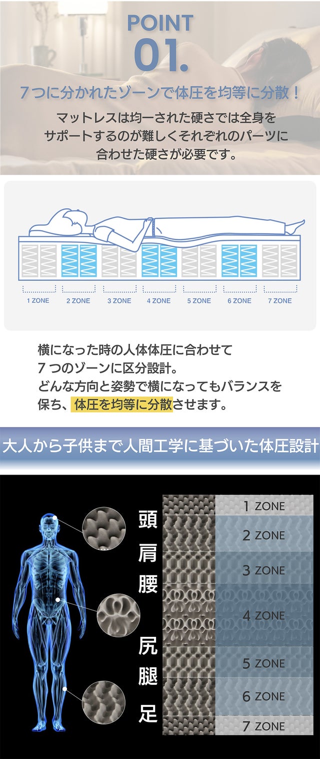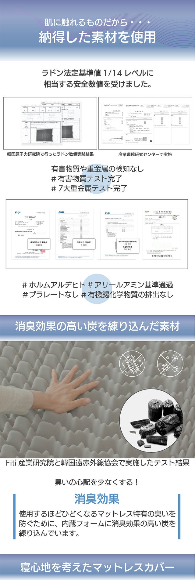 - 異なるマットレスの硬さで体圧分散!起きた時の不快感を払拭!通気性に優れた消臭素材を使用!