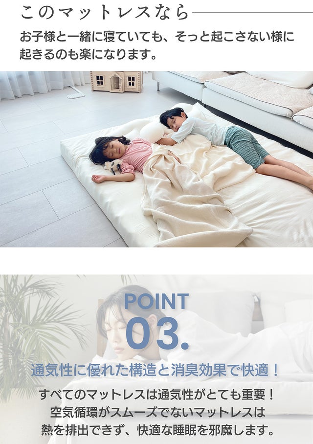 - 振動が伝わりにくいから寝ている子供も起こさない!ヘタレにくい頑丈な耐久マットレス!