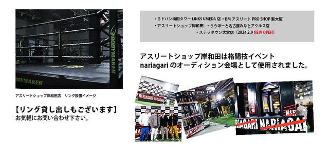 BODYMAKERは実際にトレーニングマシンや格闘用品を手に取ってみて頂ける直営店舗がございます。大阪の岸和田にあるアスリートショップ岸和田は皇治選手が立ち上げた格闘技イベント「NARIAGARI」のオーディション会場としても使用されました。ボクシングリングがある店舗。