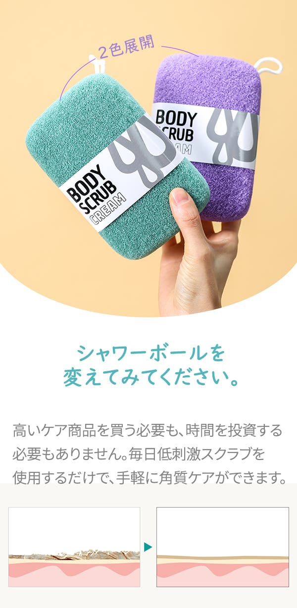 PURERAINボディスクラブは垢すりタオルのように垢を強くこすり出すのではなく、自然にやさしく角質層を整えてくれるシャワーボールです。