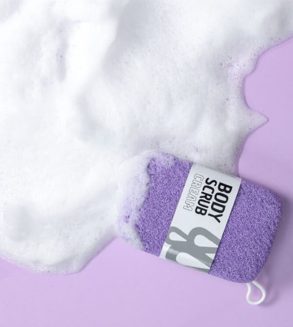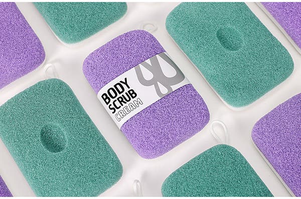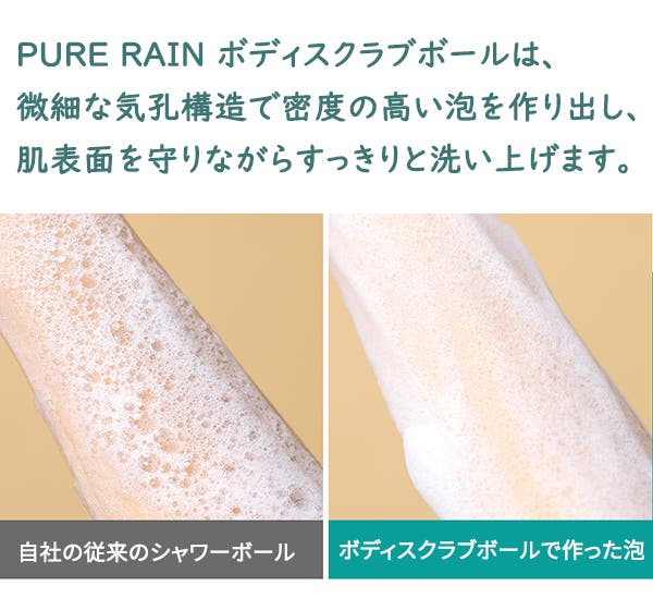 PURE RAIN ボディスクラブボールは、微細な気孔構造で密度の高い泡を作り出し、肌表面を守りながらすっきりと洗い上げます。