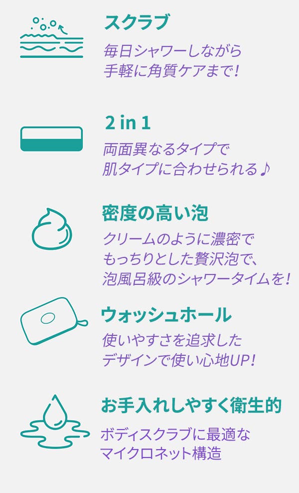 - ボディスクラブに最適なマイクロネット構造で、水はけが良く衛生的です。