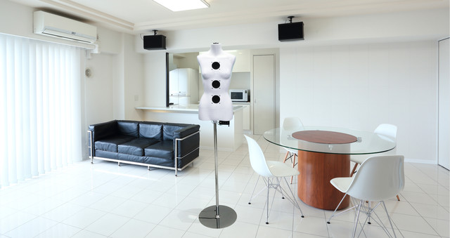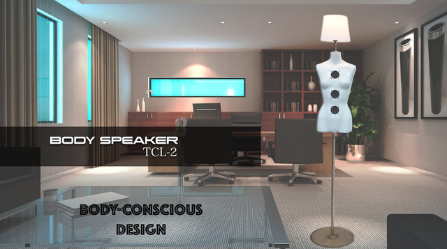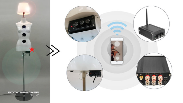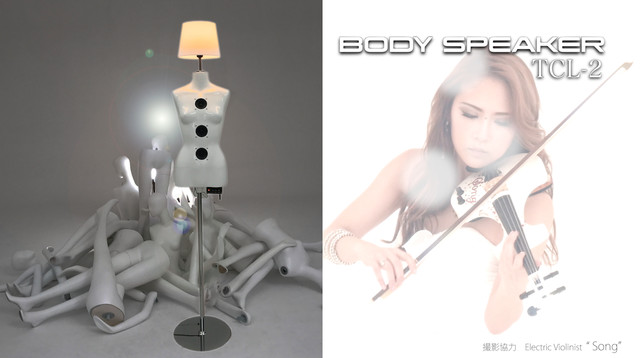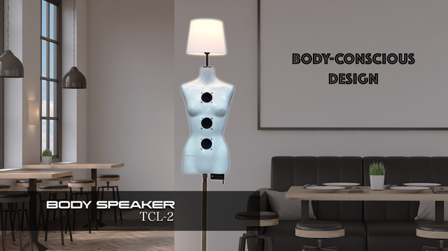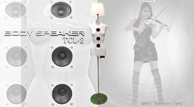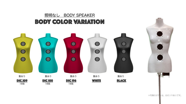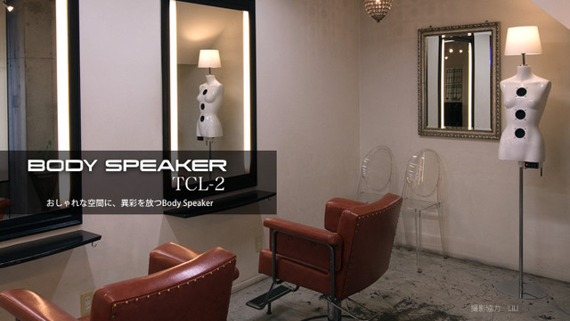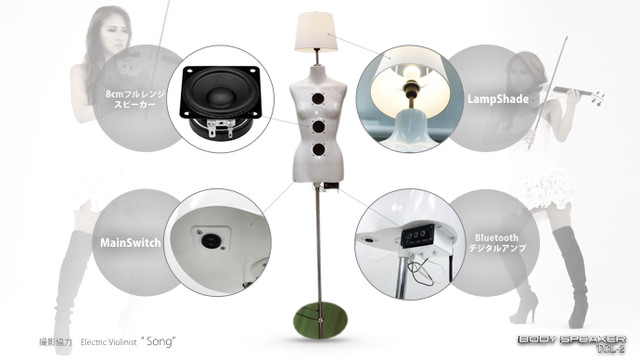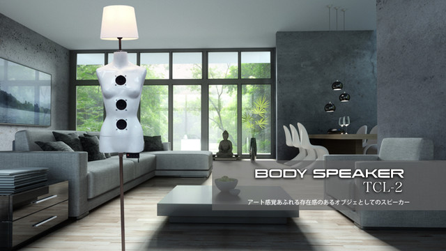 ショーウィンドーに飾られているマネキンを見ていて、この『マネキンのボディにスピーカーを搭載できないだろうか?』単純な発想からこの製品プロジェクトが始まりました。女性の曲線を帯びたシルエットが弦楽器のフォルムに相通じる部分があり、きっと音の響きもいいはず?といった素人考えからです。企画をマネキン会社の造形の企画の方に話を持ち込み、スピーカー部分を搭載する箇所をフラットに整えるなどスピーカー、エンクロージャーとして適したものにするために新たにデザインし、何度も試行錯誤を繰り返しました。こだわりの3スピーカーを搭載し、うち一つをウーファーに割り当て重低音の聞いたクリアなサウンドに仕上げました。