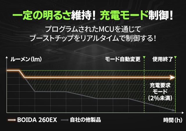 知能型マザーボード(MCUチップ、LEDブースター)を搭載し、バッテリー残量が2%未満になるまで一定の明るさを維持します。