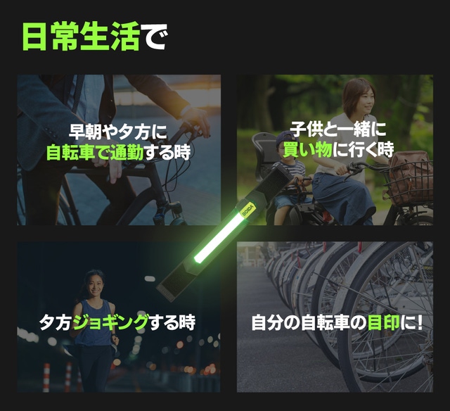 夜道で危ない! と感じた経験ありませんか?私は夜道を歩いていると自転車が飛び出したりして驚いたことがあります。その時、夜道で運転手に自分の存在をアピールして避けてもらうのが重要だと思いました。腕、腰、ヘルメット、バッグなどに取り付けて使えるフレキシブルライトをご紹介します。LEDとリフレクトシートを組み合わせたシグナルライトで、ヘッドライトなどの光を浴びた時にはさらに明るく見えてしっかり居場所をアピールできます!是非試してください!