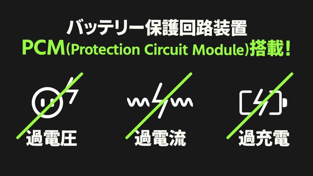 バッテリー保護回路装置であるPCMが搭載されており、過電圧、過電流、過充電を抑えてより便利に使えます。