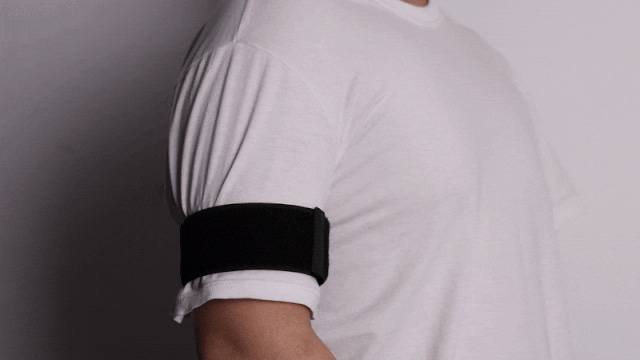 1. ベルクロストラップに付いている着用サポートフックを腕に入れて巻いた後、ベルクロを使って固定してください。