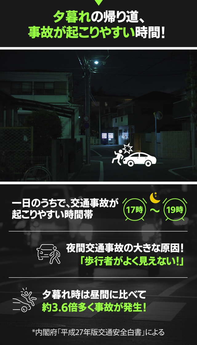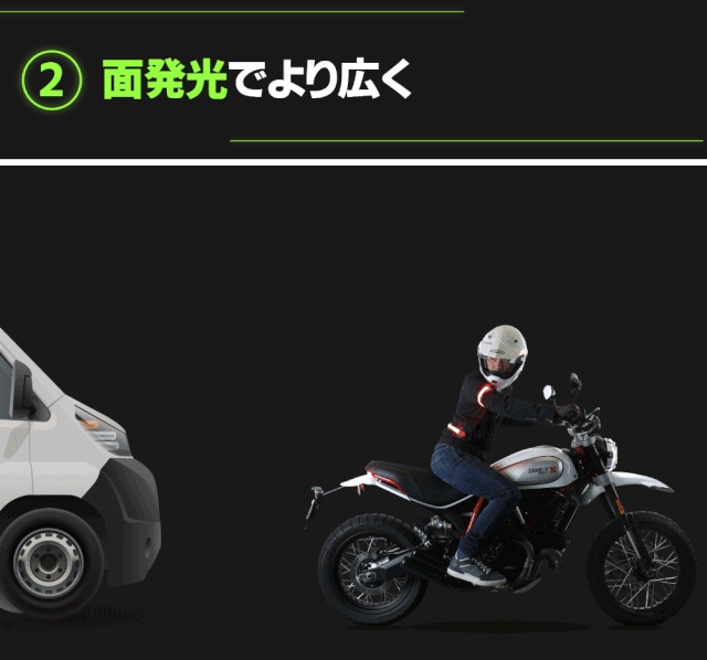 LEDライトと超広角高輝度再帰反射が融合した独自的な技術で、より明るく、より遠く! 車の運転手に光を伝達し、自分の位置をアピールすることができます。