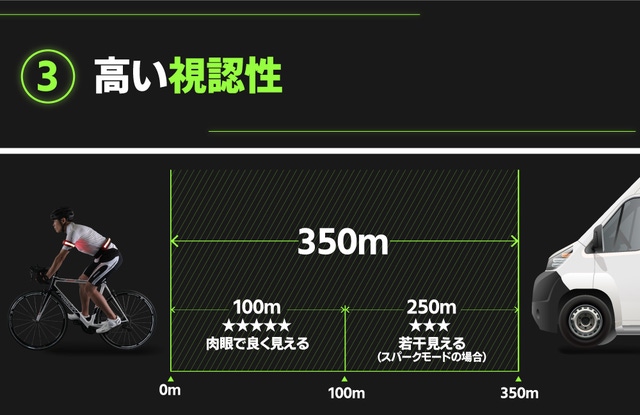 A. 着用時は約100mの距離で肉眼ではっきりと識別でき、最大350mの距離(スパークモードの場合)で光を認知することができます。