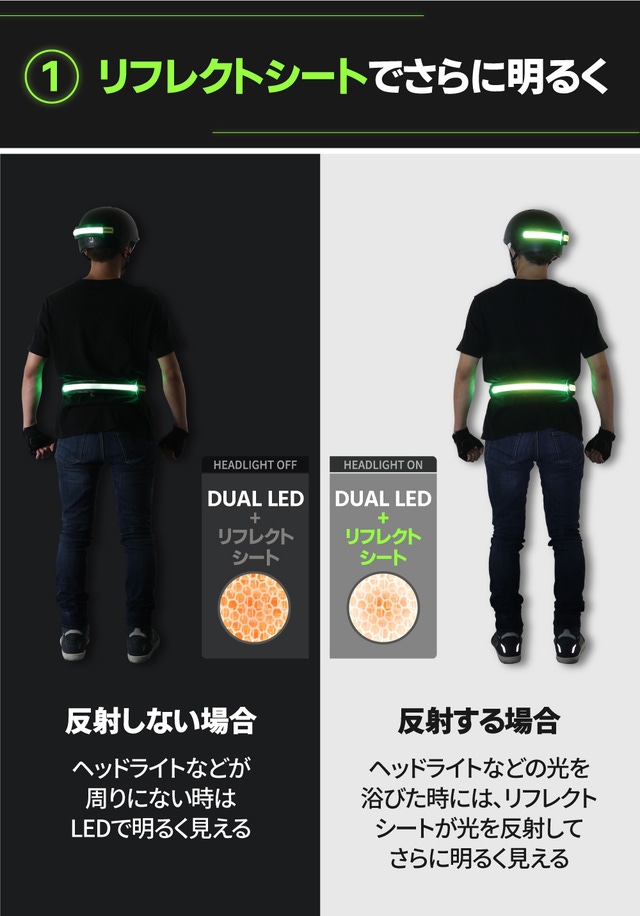 - LEDライト+リフレクトシートで存在アピール!夜間や暗所の安全対策に!アクティビティにも最適!