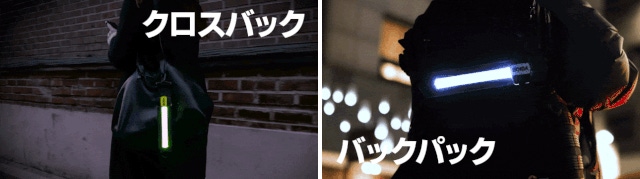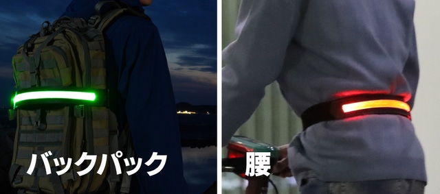 フレキシブルライトで腕、腰、ヘルメット、バッグなど様々なところに取り付けて使用できます。
