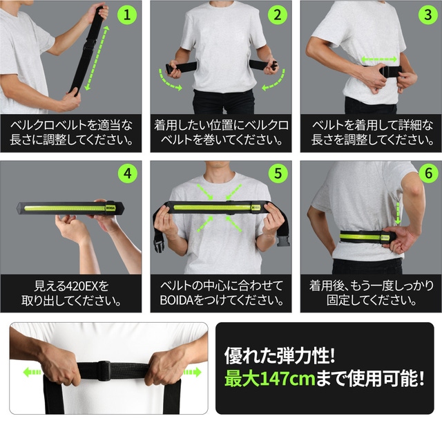 腕や腰などの身体部位に密着させて使用ししたり、ヘルメットやバッグに貼り付けることができ、便利に使用できます。