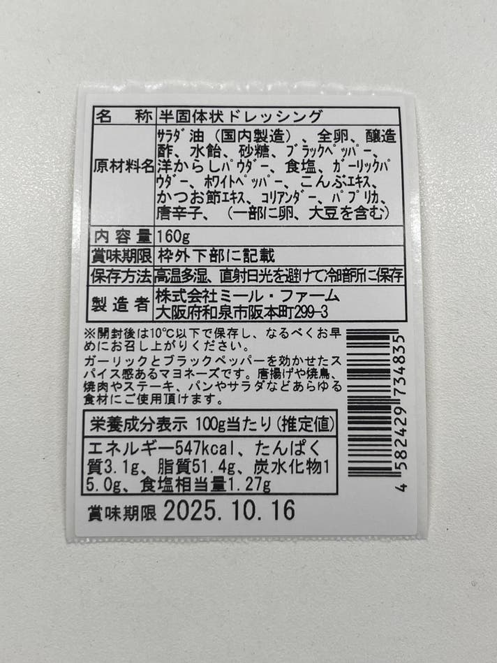 サラダ油(国内製造)、全卵、醸造酢、水飴、砂糖、ブラックペッパー、洋からしパウダー、食塩、ガーリックパウダー、ホワイトペッパー、こんぶエキス、かつお節エキス、コリアンダー、パプリカ、唐辛子、(一部に卵、大豆を含む)