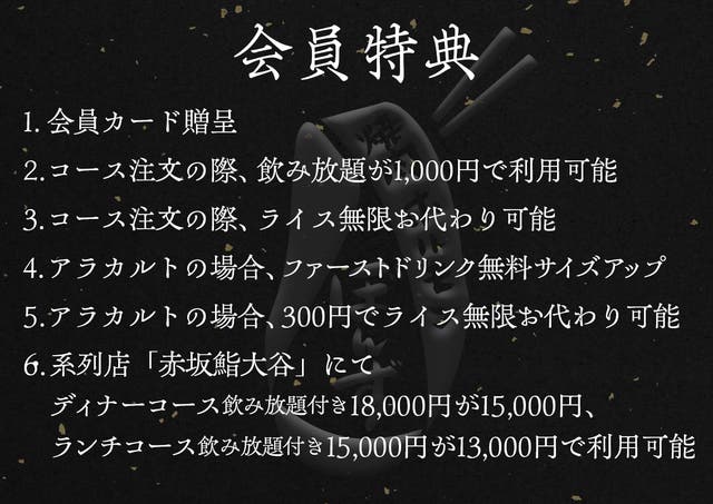 系列店である『赤坂 鮨大谷』のディナーコース(飲み放題付)18,000円が15,000円に、またはランチコース(飲み放題付)15,000円が13,000円で利用可能になる。