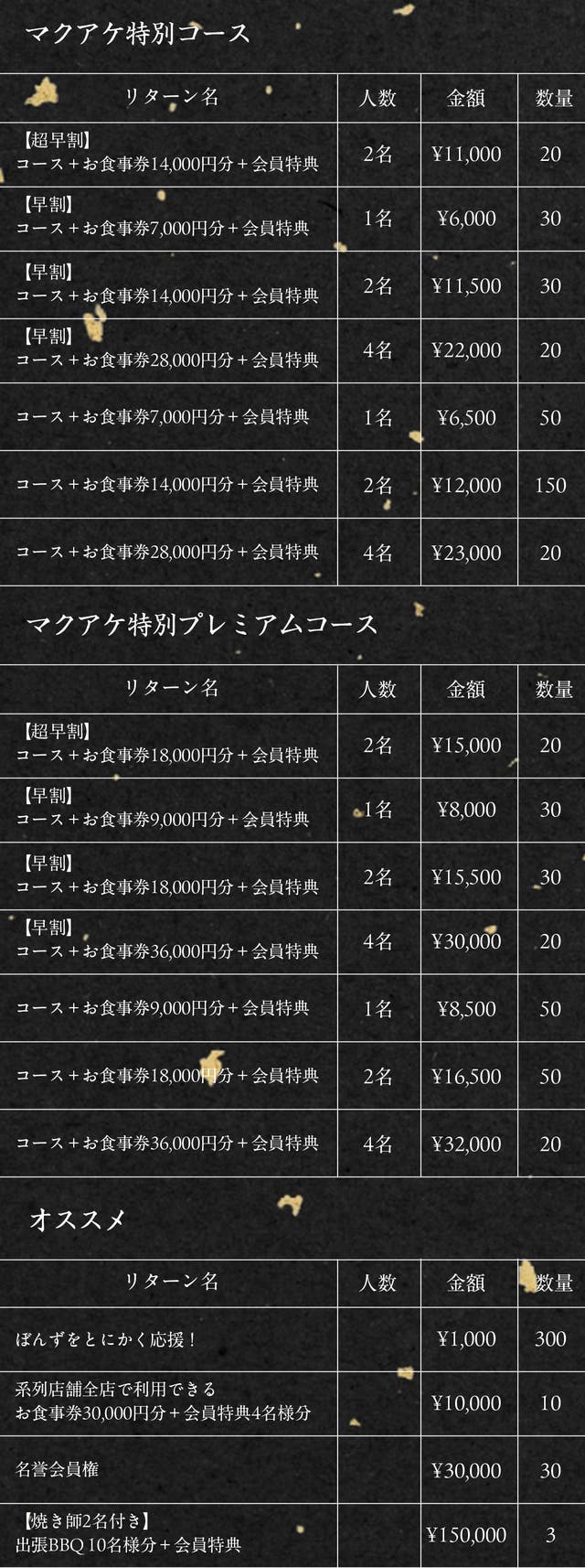 【早割】マクアケ特別プレミアムコース4名様分+お食事券36000円分+会員特典