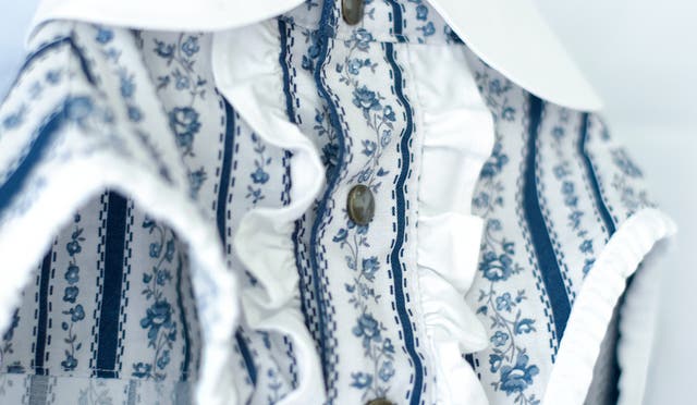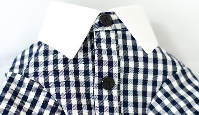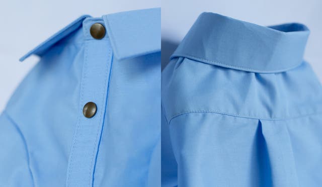白い襟付きで、きちんとした印象を加えつつ、ボタン風のスナップボタンは、フォーマルに見えつつも、簡単に着脱できる実用的なデザインです。