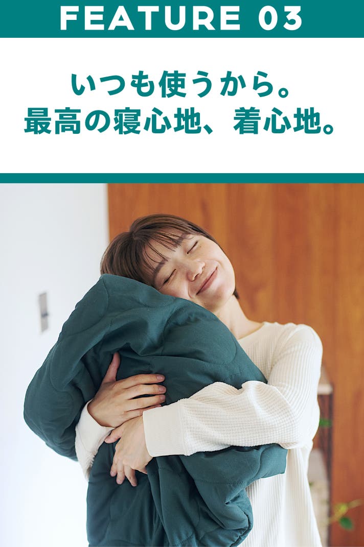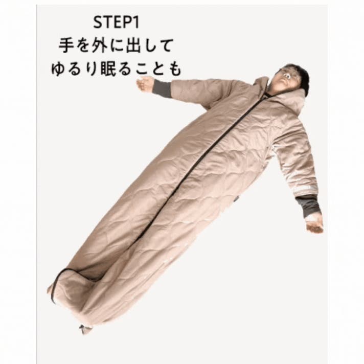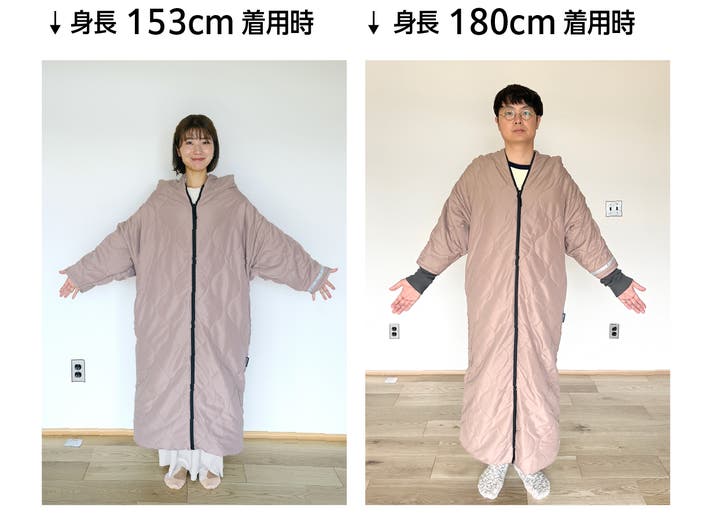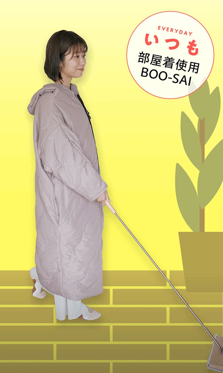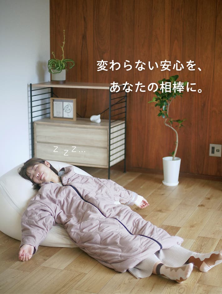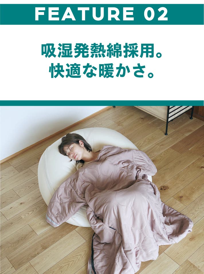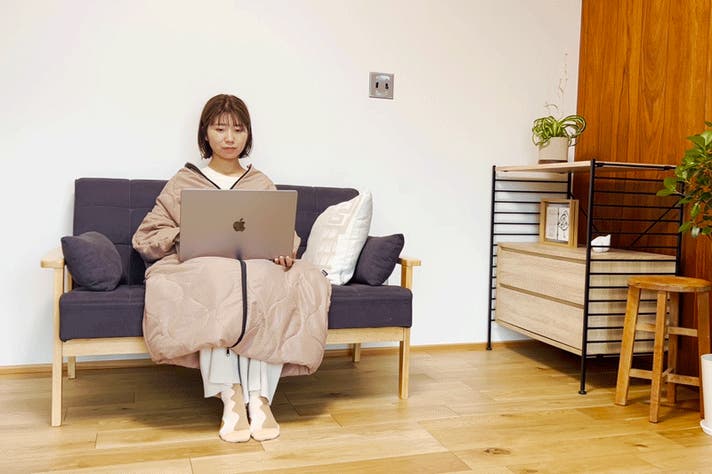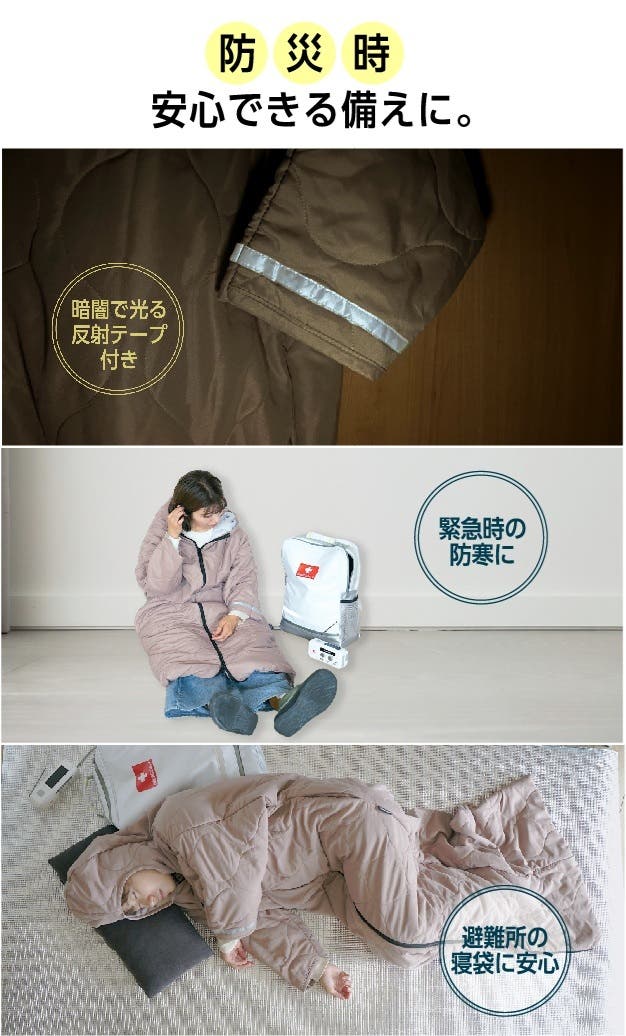 おうちでぬくぬく。脱いでいかなくても、そのままトイレへなんてことも可能「ベンチコート型」は着たまま手足が自由に動くことができるので、避難場所でも快適に使用できます。