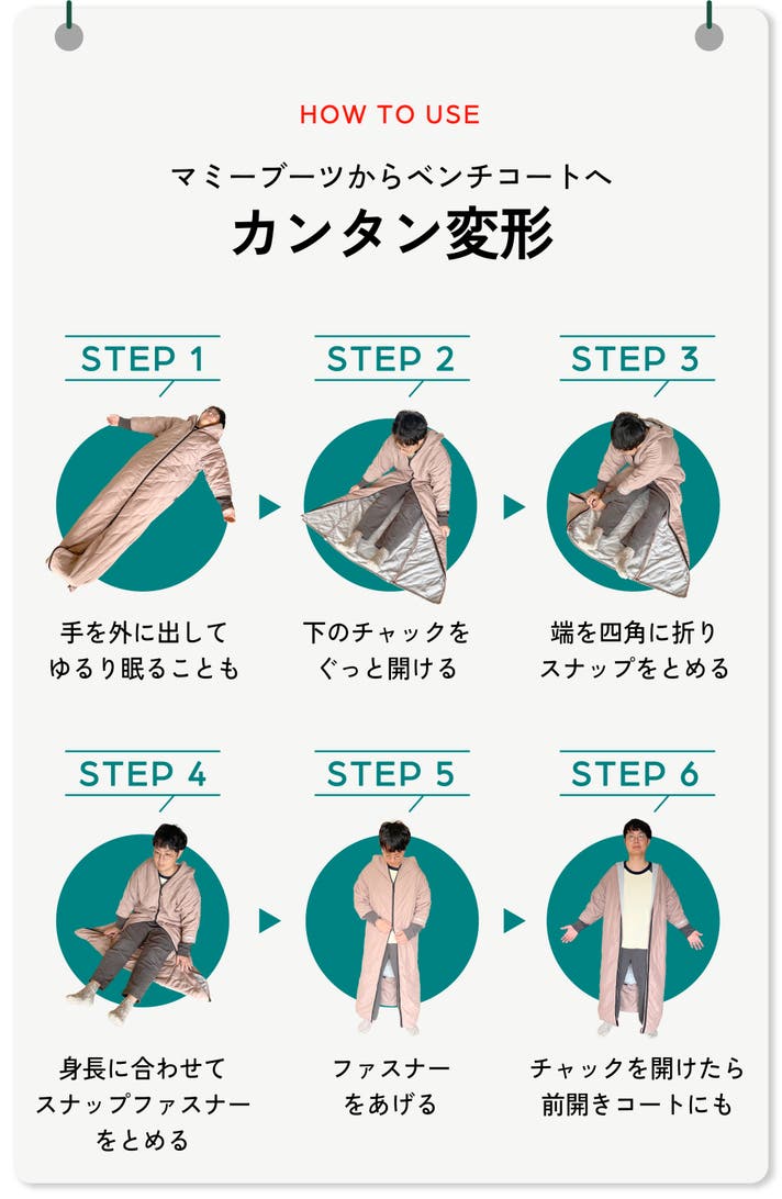 スナップファスナーを留めるだけで身長に合わせてコートの丈を変えたり、寝袋からコートへ変化させたり。