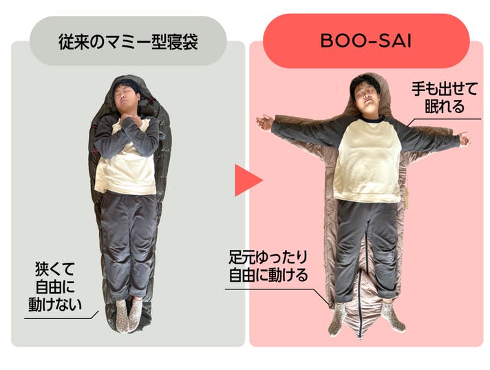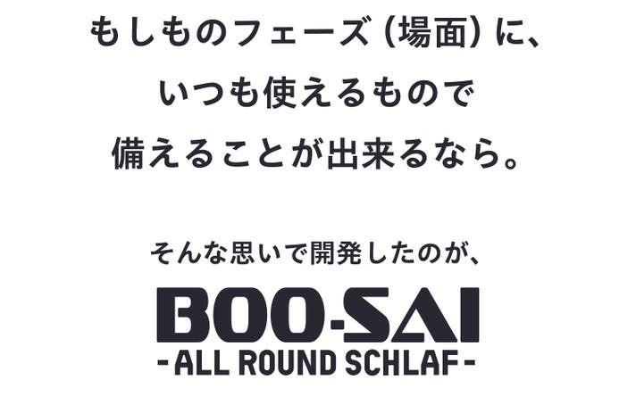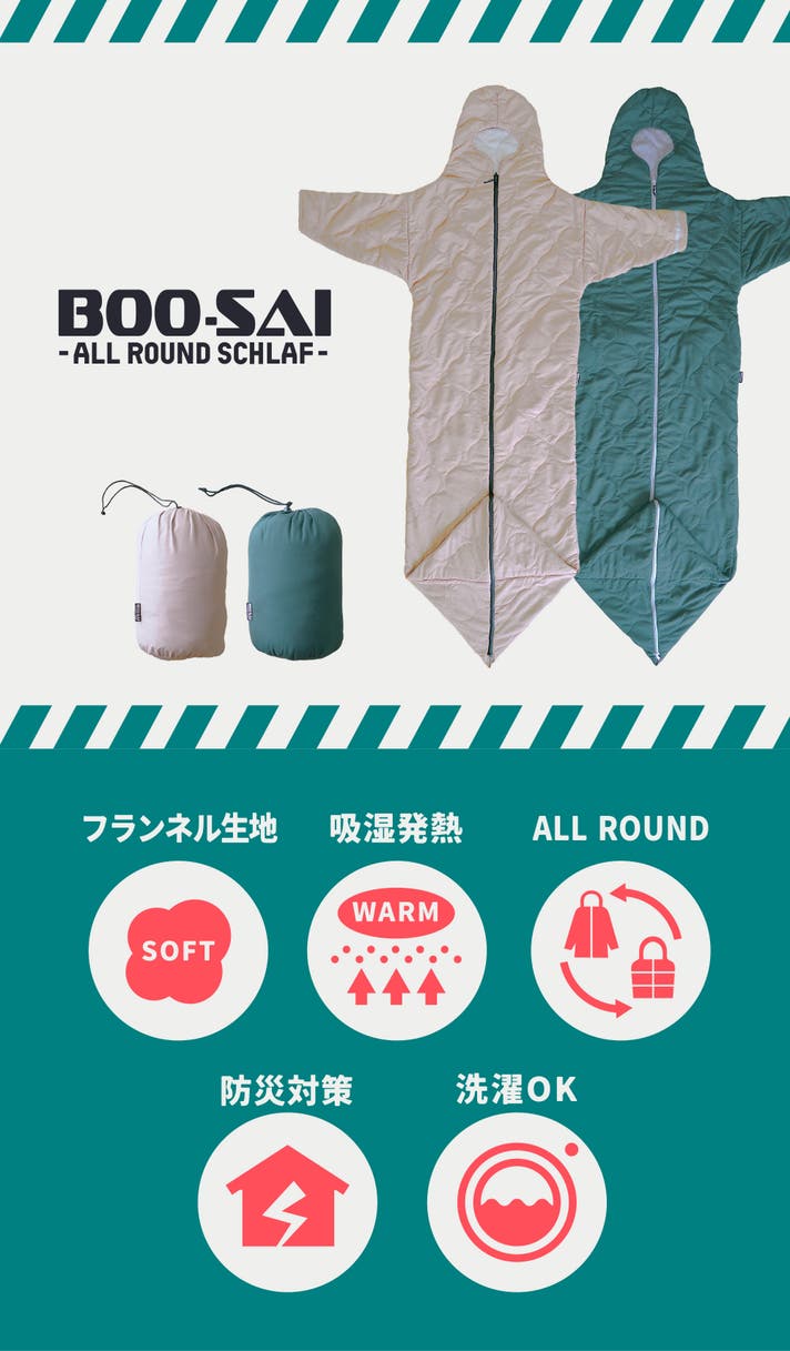 どんな時もいつもと変わらない快適な眠りをお届けしたい!と、 2021年夏、第一弾として、多機能シュラフ「レリーバー®︎シュラフ」を開発。さらにみなさんにより良い商品をお届けするため今回、ALL ROUND SCHLAF【BOO-SAI 】を限定販売いたします。