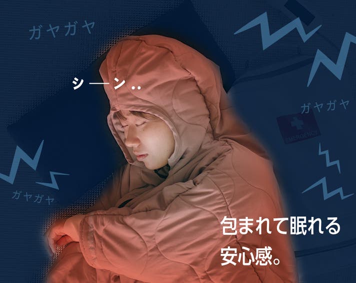 例えば避難所で。普段と違う環境でも、周りの音が遮断できプライベートが保たれ、睡眠をとることが出来るマミー型のフード。